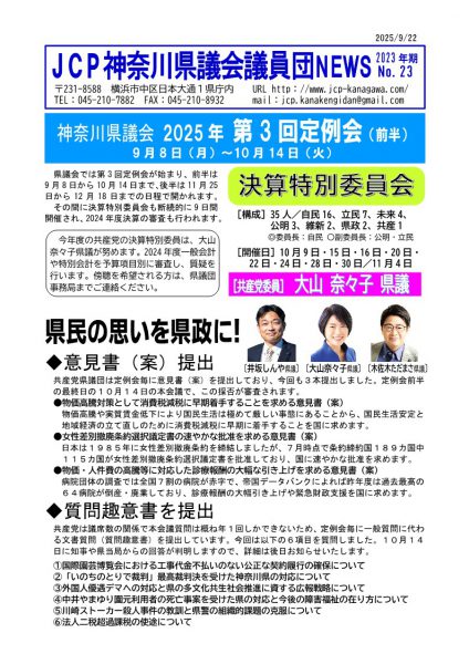 ◆意見書(案)を提出しました ・物価高騰対策として消費税減税に早期着手することを求める意見書(案) ・女性差別撤廃条約選択議定書の速やかな批准を求める意見書(案) ・物価・人件費の高騰等に対応した診療報酬の大幅な引き上げを求める意見書(案)