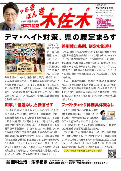 ◆差別禁止条例、制定を先送り川崎市のような罰則付きの差別禁止条例を制定し、県内全域での抑止を