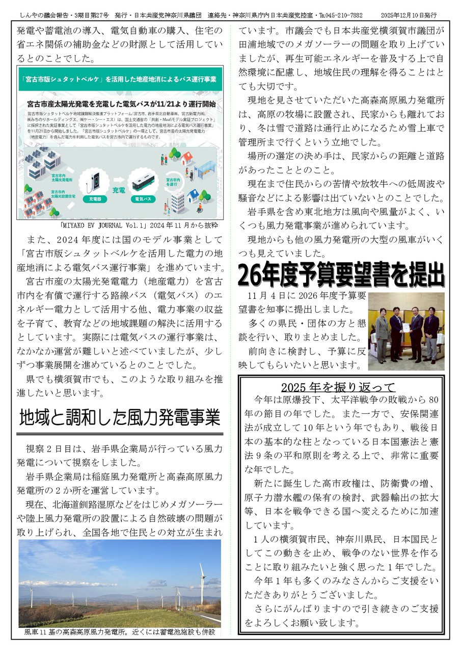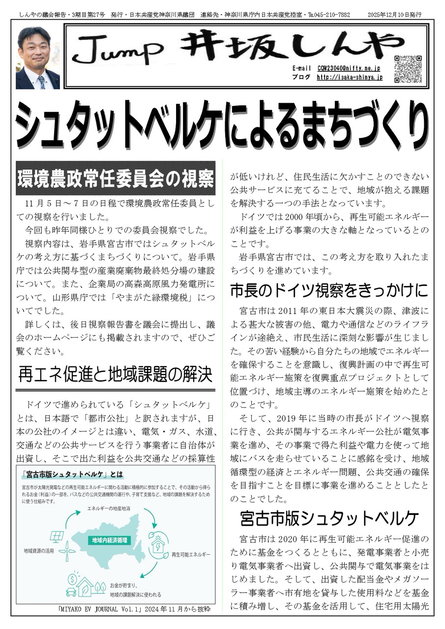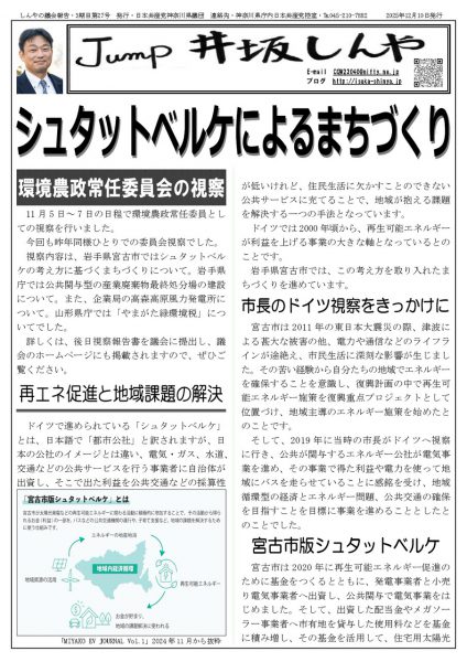 ◆環境農政常任委員会の視察 岩手県宮古市で再エネ促進と地域課題の解決について学ぶ ・市長のドイツ視察をきっかけに始めた宮古市版シュタットベルケ ・震災と津波による甚大な被害――復興計画の中で再エネを重点に
