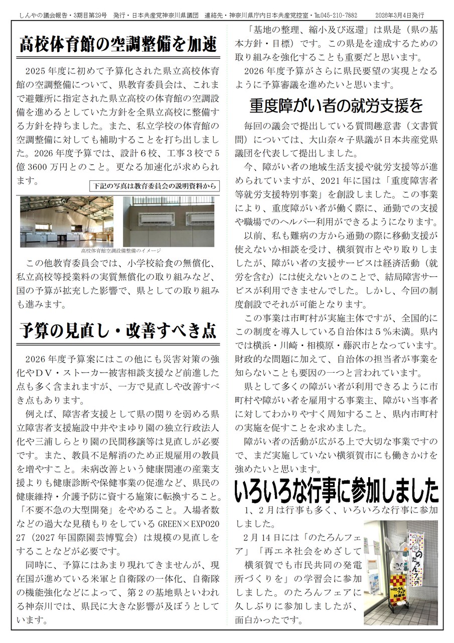 ◆予算の見直し・改善すべき点障がい者支援への県の関わりを弱めるのは見直すべき教員不足解消のためもっと正規雇用の教員を増やすこと健康診断や保健事業を促進するGREEN×EXPO2027(花博)は規模の見直しを等々