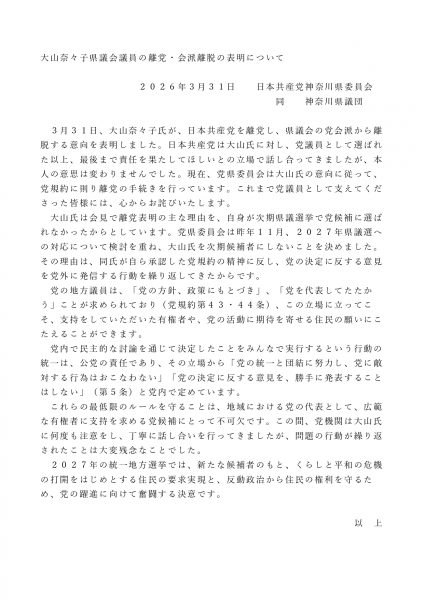 2026年3月31日に大山奈々子議員が離団しましたので日本共産党神奈川県委員会と日本共産党神奈川県議会議員団の声明をお知らせします。